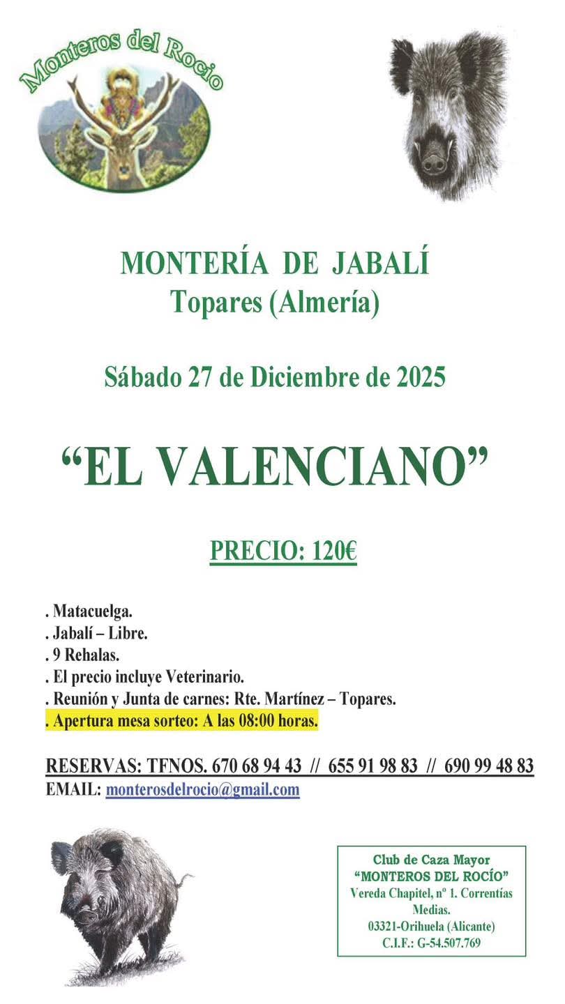 Tras la montería celebrada el pasado 30 de noviembre en LERIA-TELLO, en la que consiguieron abatir 20 cochinos y 3 arruis, los MONTEROS DEL ROCÍO vuelven a la carga para cazar el próximo 27 de diciembre en Topares, Almería, la mancha EL VALENCIANO, un acotado en abierto que siempre deja buenos resultados y agradables sorpresas, y que se montea bajo la modalidad de matacuelga por sólo 120€/puesto.