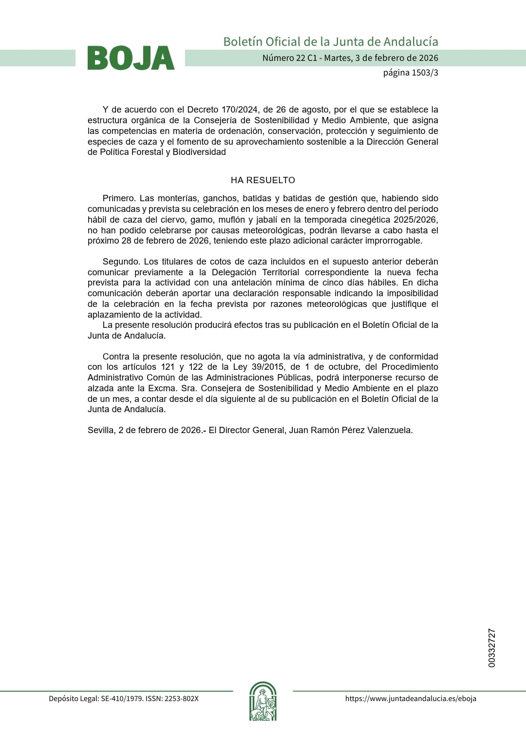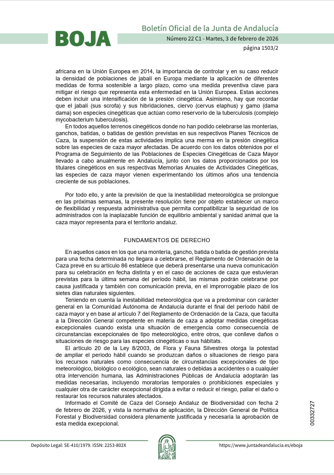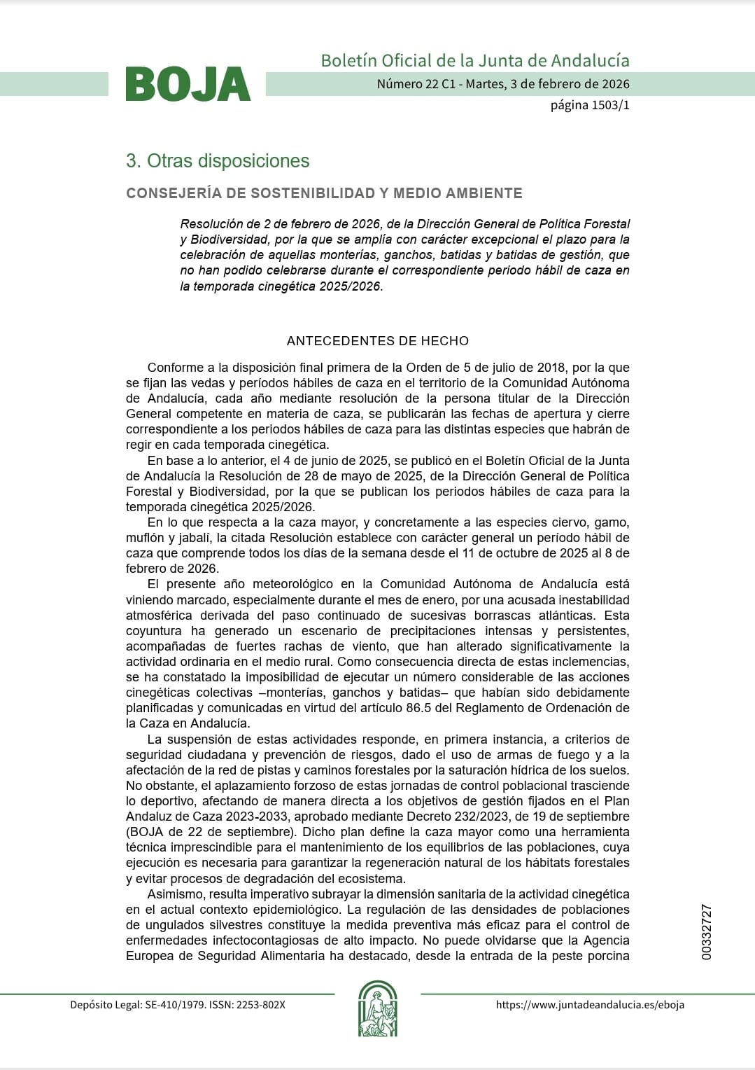 La Junta de Andalucía acaba de publicar en BOJA la Resolución de 2 de febrero de la Dirección General de Política Forestal y Biodiversidad por la que se amplía con carácter excepcional el plazo para la celebración de aquellas monterías, ganchos, batidas y batidas de gestión, que no pudieron celebrarse durante el periodo hábil de caza en la temporada cinegética 2025-2026 por causas meteorológicas adversas, y que gracias a esta ampliación podrá celebrarse, con carácter improrrogable, hasta el 28 de febrero.