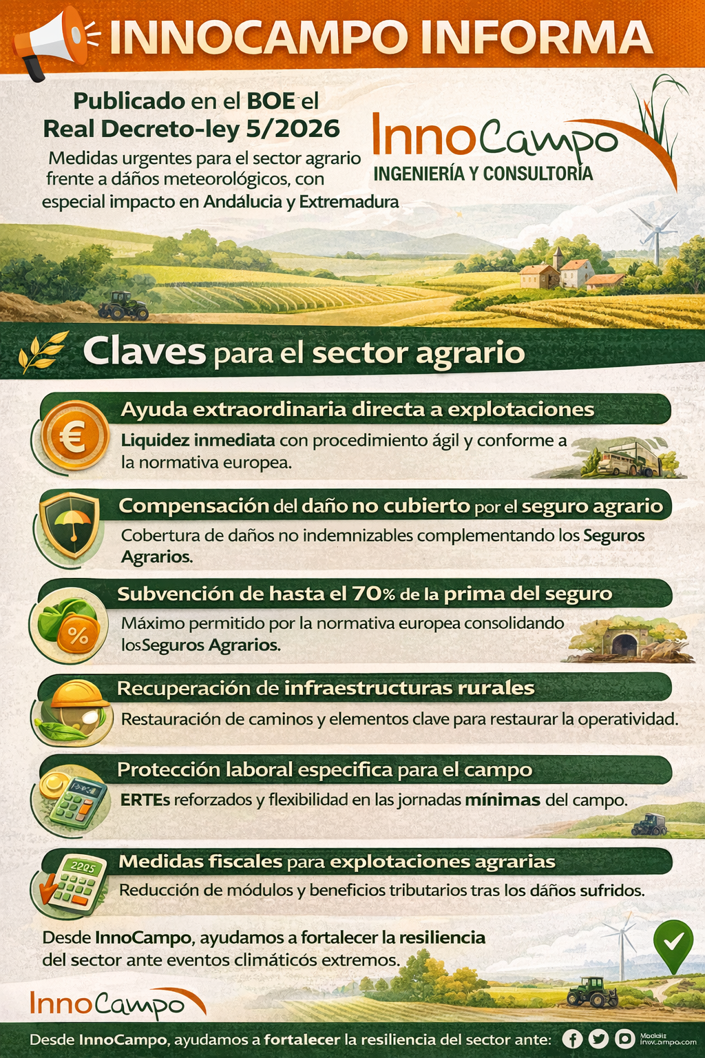 INNOCAMPO INFORMA que el 19 de febrero fue publicado en el BOE el Real Decreto-ley 5/2026, por el que se adoptan medidas urgentes para hacer frente a los daños causados por fenómenos meteorológicos adversos, con especial incidencia en Andalucía y Extremadura.