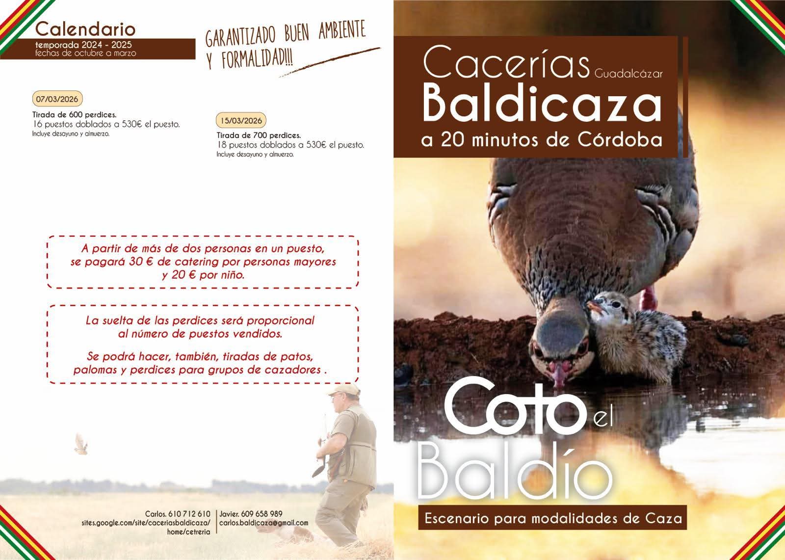 Desde octubre de 2025 hasta marzo de 2026 disfruta de jornadas únicas en el Coto El Baldío, en Guadalcázar, a 20 minutos de Córdoba. Un escenario de caza preparado a conciencia para el disfrute de los participantes, donde se cuida al detalle y con total profesionalidad cada tirada con el único objetivo de que los cazadores vivan una jornada inolvidable y cumplan con sus expectativas.