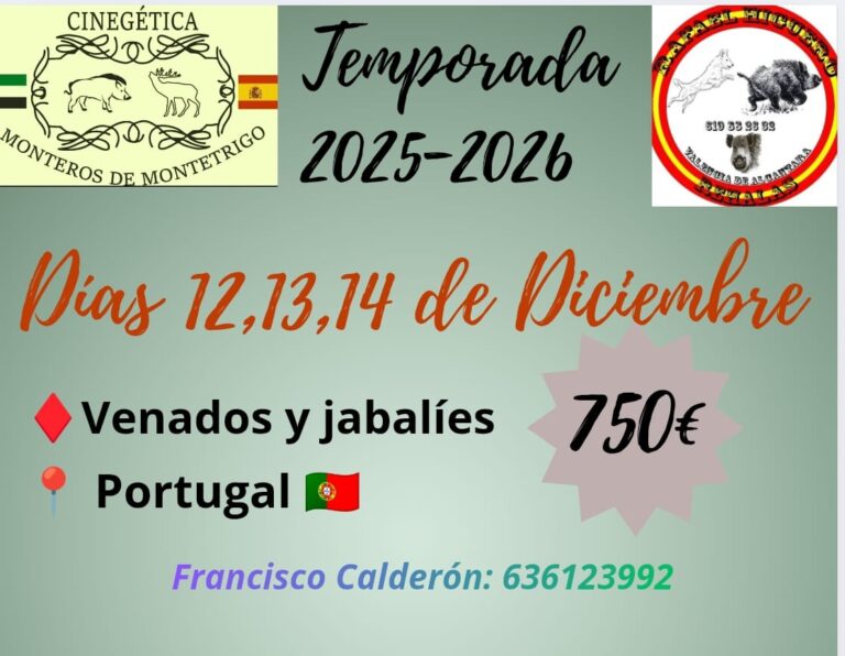 | 01/02/2026 | ![]() | CÁCERES | DEHESA DE TIRACALZAS | A | ![]() | MONTEROS DE MONTETRIGO | – | J/V/G/Cva | S/C | 300 | Más info 689654327 |