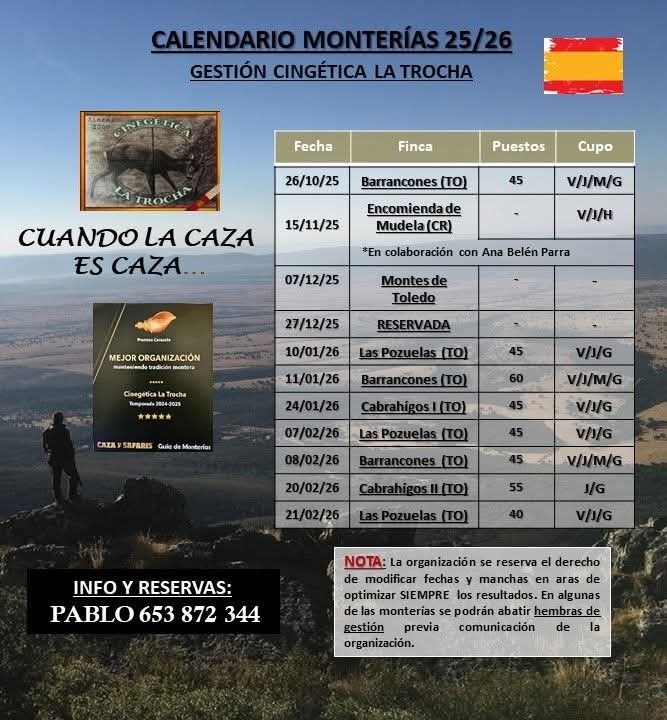 | 24/01/2026 | ![]() | TOLEDO | CABRAHÍGOS I | A | ![]() | CINEGÉTICA LA TROCHA | 45 | J/V/G | S/C | – | Reserva |