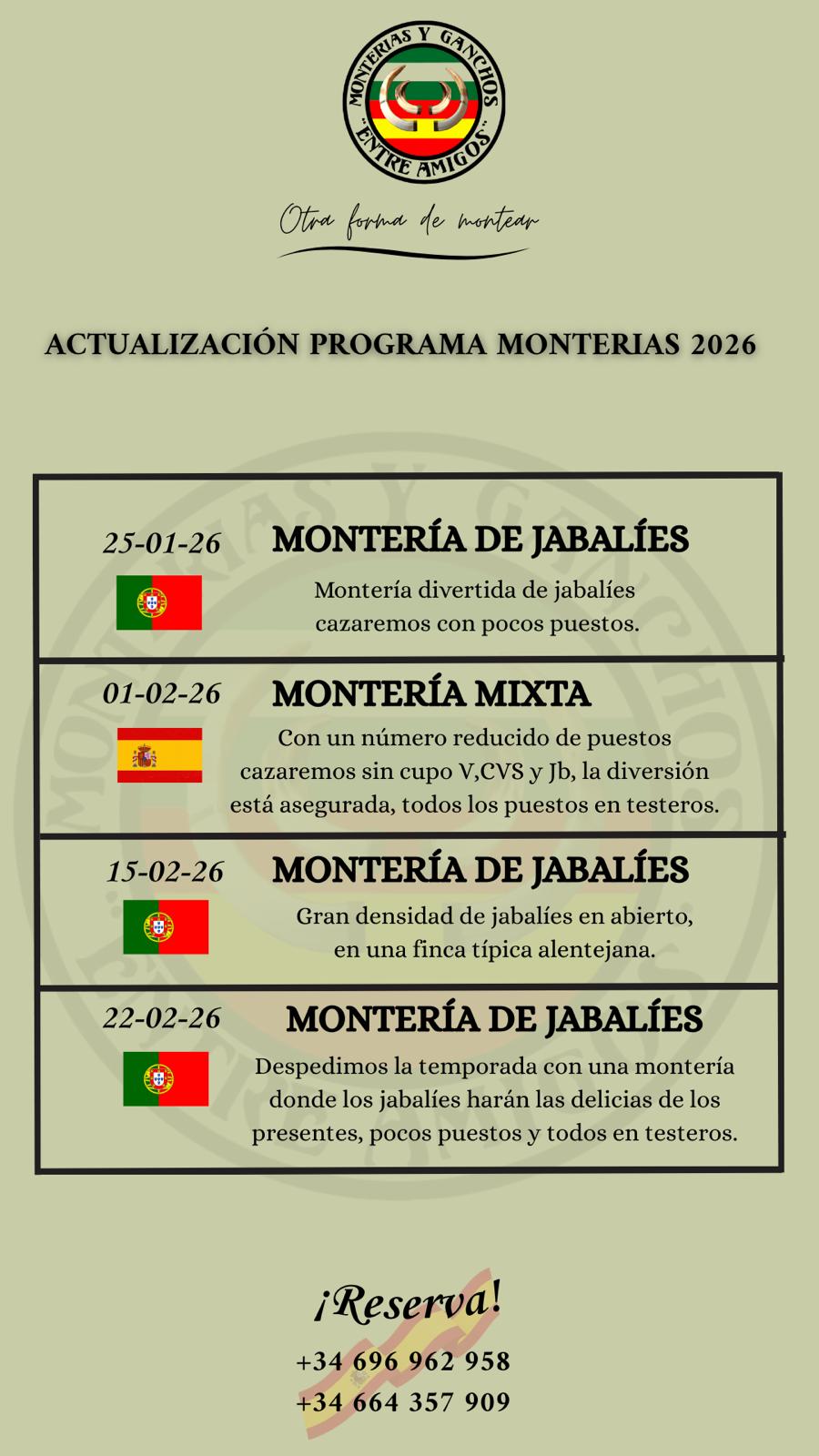 | 10/1/2026 | ![]() | PORTUGAL | EUCALIPTAL | A | ![]() | MONTERÍAS Y GANCHOS ENTREAMIGOS | – | J | S/C | – | Más info 689654327 |