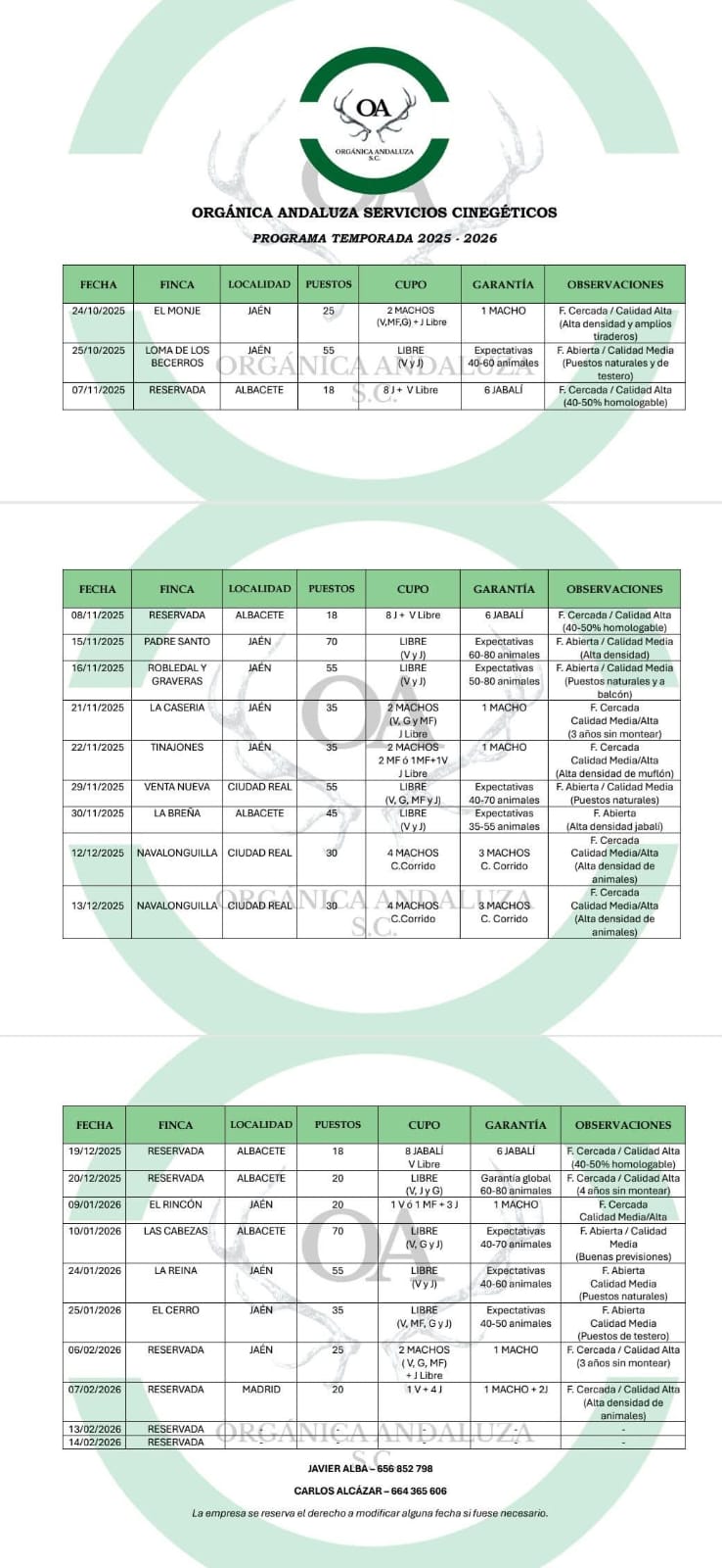 | 10/1/2026 | ![]() | ALBACETE | LAS CABEZAS | C | ![]() | ORGÁNICA ANDALUZA SC | 70 | J/V/G | S/C | – | Más info 689654327 |