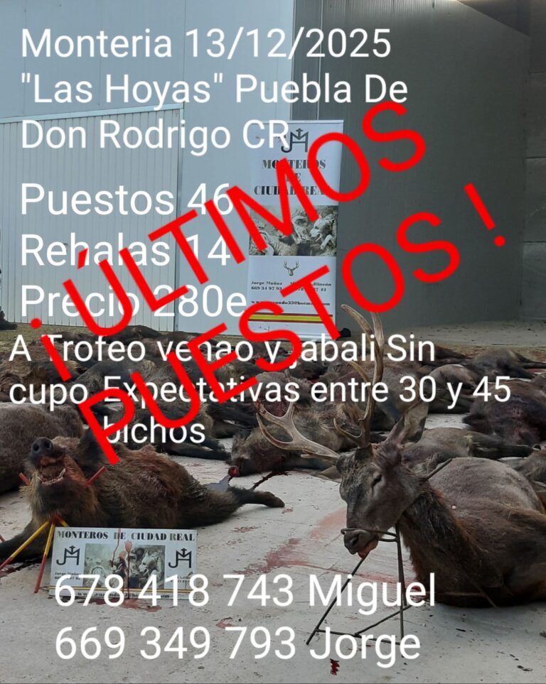 | 10/01/2026 | ![]() | CIUDAD REAL | VIÑAS Y CAÑADAS | A | ![]() | MONTEROS DE CIUDAD REAL | 55 | J/V | S/C | 400 | Más info 689654327 |