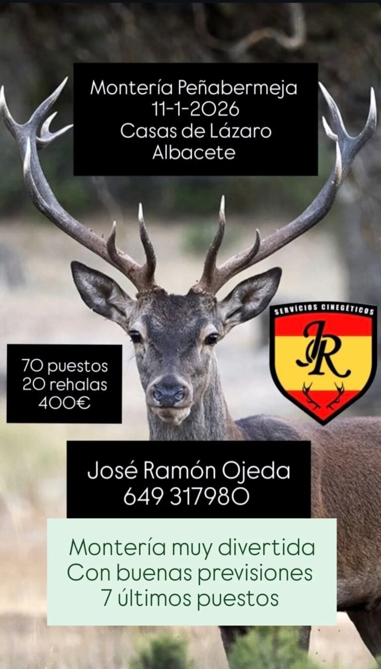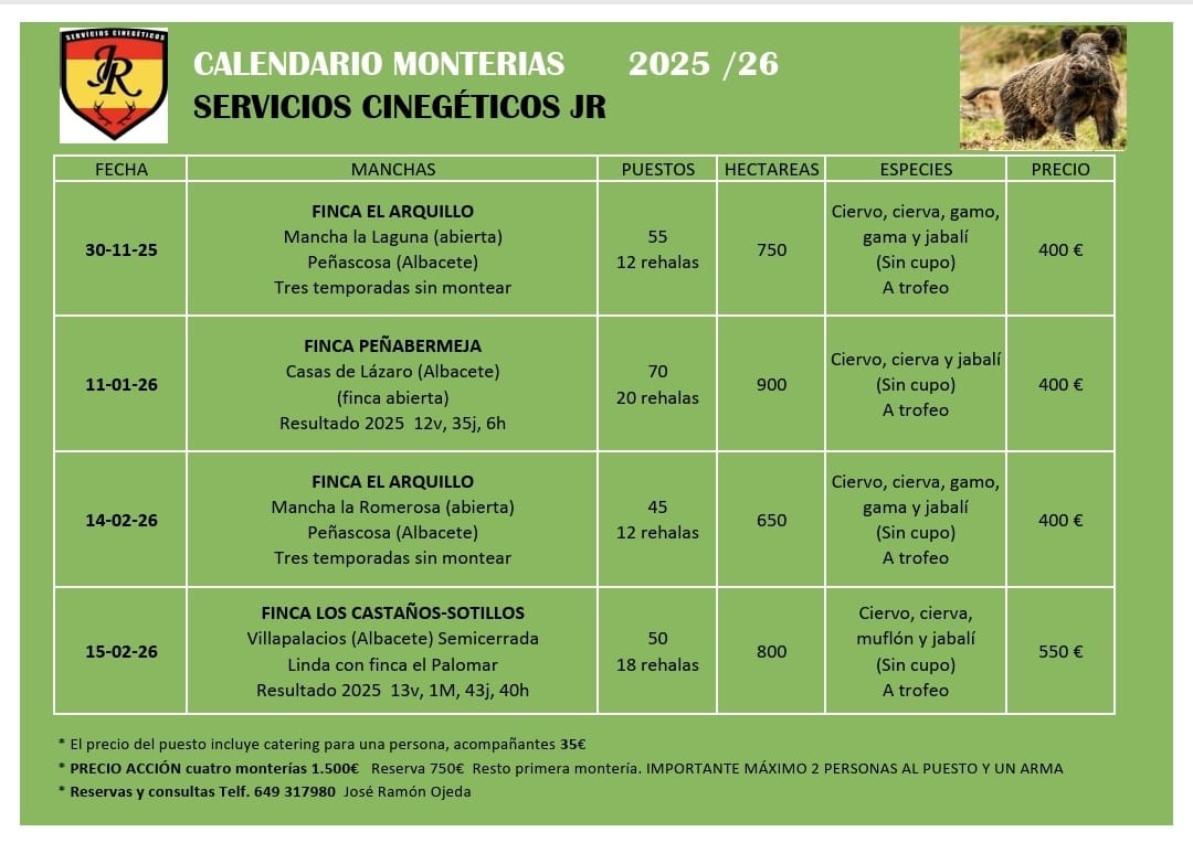 | 14/2/2026 | ![]() | ALBACETE | EL ARQUILLO | A | ![]() | SERVICIOS CINEGÉTICOS JR | 45 | J/V/G/Cva/Gma | S/C | 380 | Más info 689654327 |