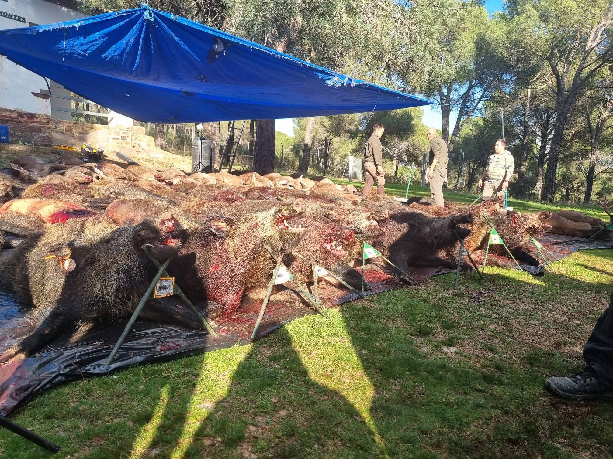 Un total de 54 guarros (7 bonitos navajeros), 2 venados (12 puntas, cumpliendo con el objetivo de no tirar a menores de 10) y 15 hembras de gestión (cierva y gama) completaron este bonito plantel que ponía fin a una exitosa campaña montera.