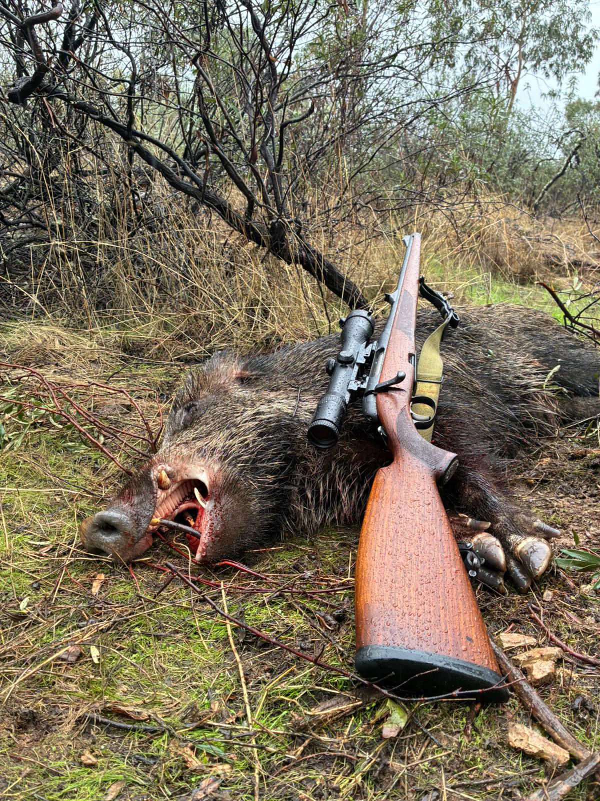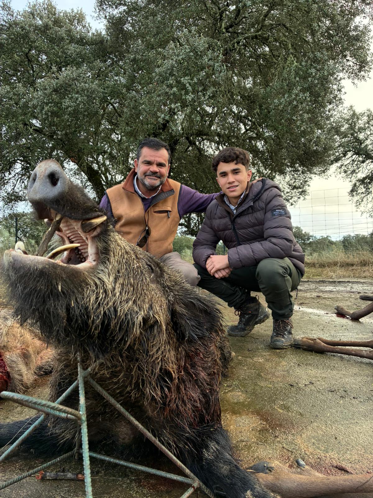 En la mancha de los eucaliptos una gran cantidad de cochinos aguantaban en sus camas. Levantar al jabalí en manchas tan cargadas de reses nunca es sencillo, los rastros se cruzan, y los perros deben afinar. La insistencia y el oficio de los rehaleros terminaron por ponerlos en pie, añadiendo emoción y apretados lances en la jornada.