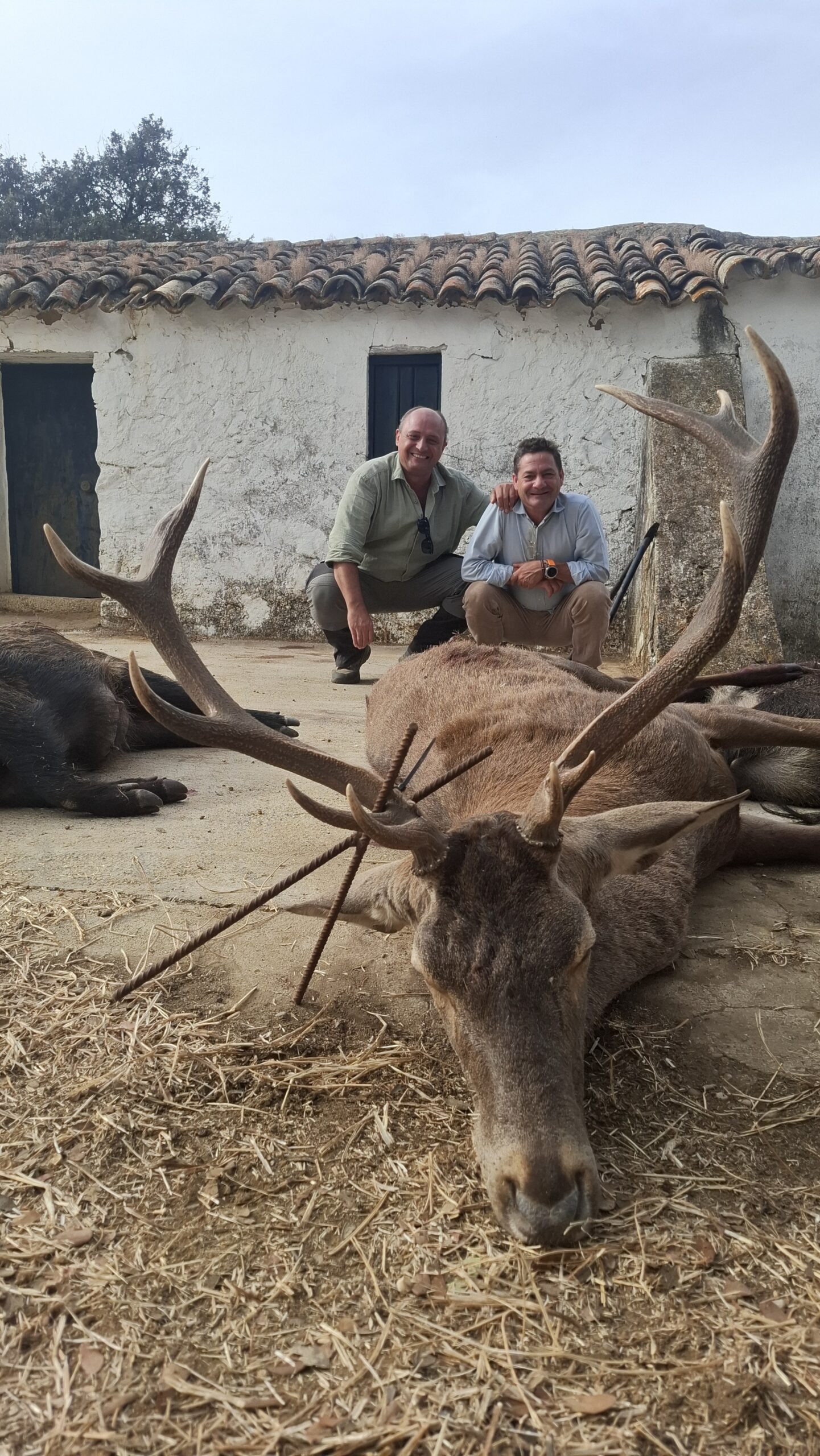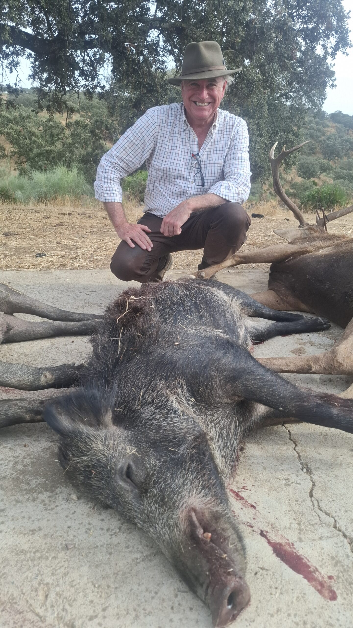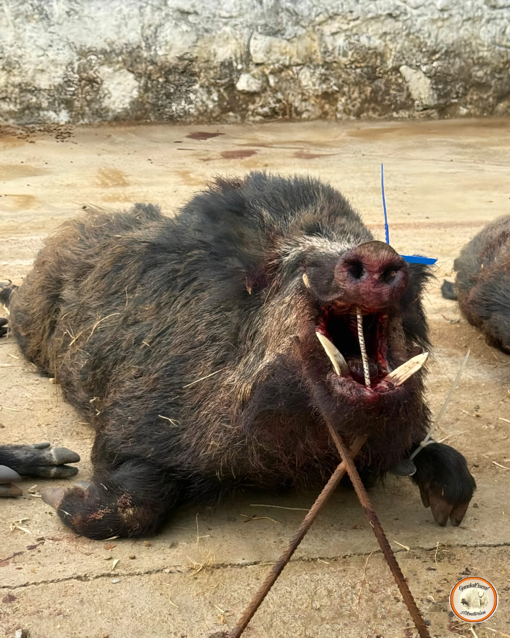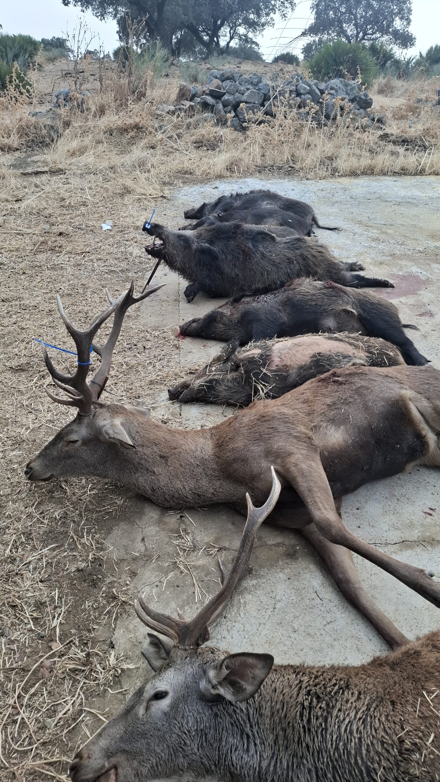 En total se abatieron 27 jabalíes, con dos navajeros, uno de ellos pendiente de medición, 2 venados y 1 cierva. Treinta animales entre 40 escopetas que pudieron ser casi el doble si las rehalas nos aguantan un par de horas más. Pero es que con este calor montear, y más a cochinos, es imposible. Ahí quedan para el año que viene.