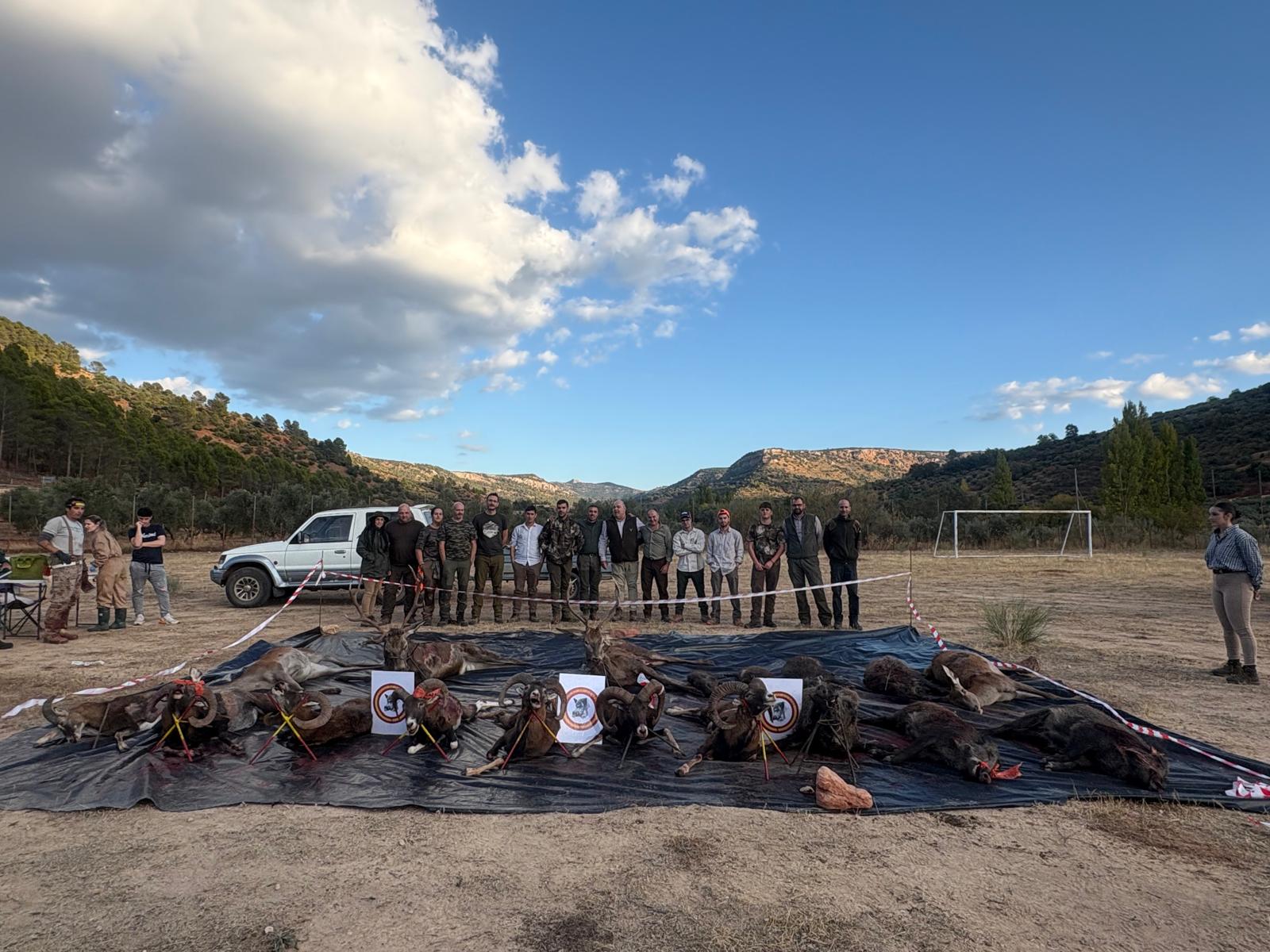 Sobre las 18:00h se formaba una alfombra de 15 jabalíes, 8 muflones y 3 venados, donde faltaba algún marrano, pero donde había una primera fila de muchos quilates con varios trofeos homologables.