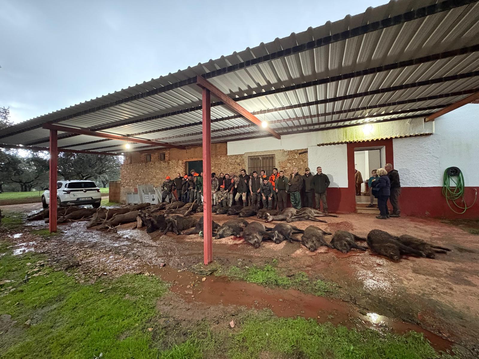 El viernes 6 cazamos Esquivias, en Casas de Don Pedro, Badajoz, con 40 puestos y 22 rehalas. Una finca con muchísima densidad de monte y un gran sopié que teníamos hasta el tapón de caza, lo que nos motivó a montearla pese al mal tiempo.