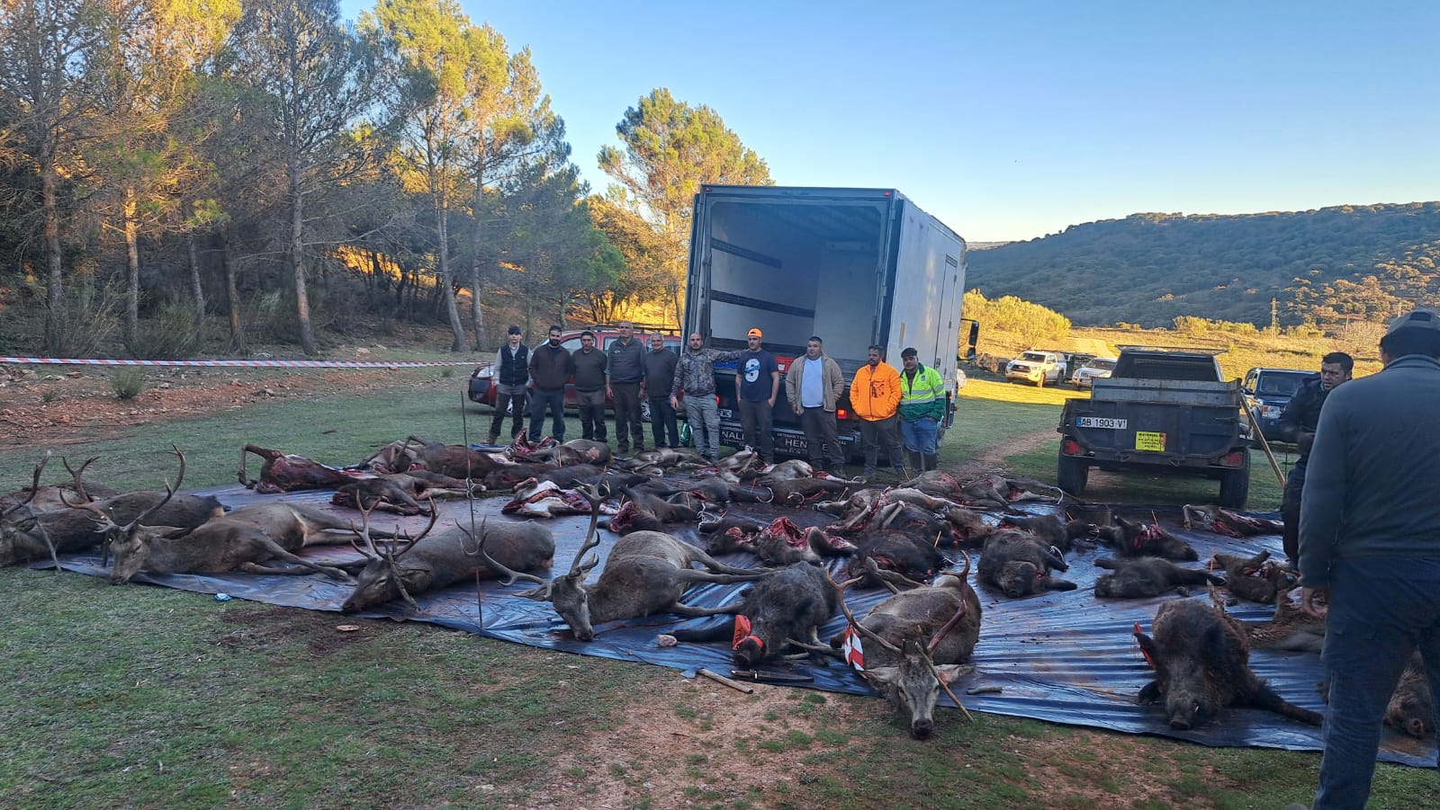 Durante la montería se contabilizaron sobre 300 tiros, y con 74 puestos y 9 rehalas se cobraron 6 ciervos, 25 guarros, con dos navajeros entre ellos,15 ciervas y 2 gamas.