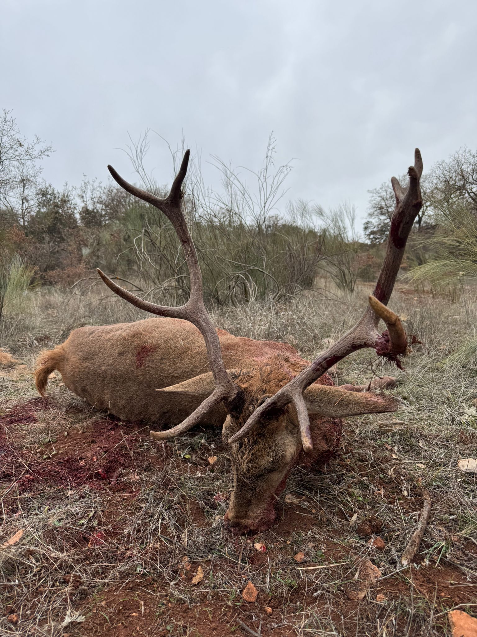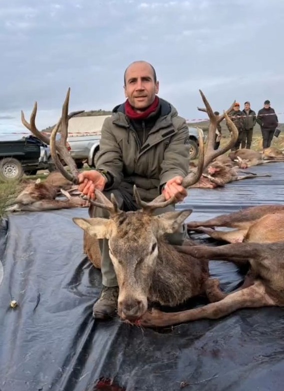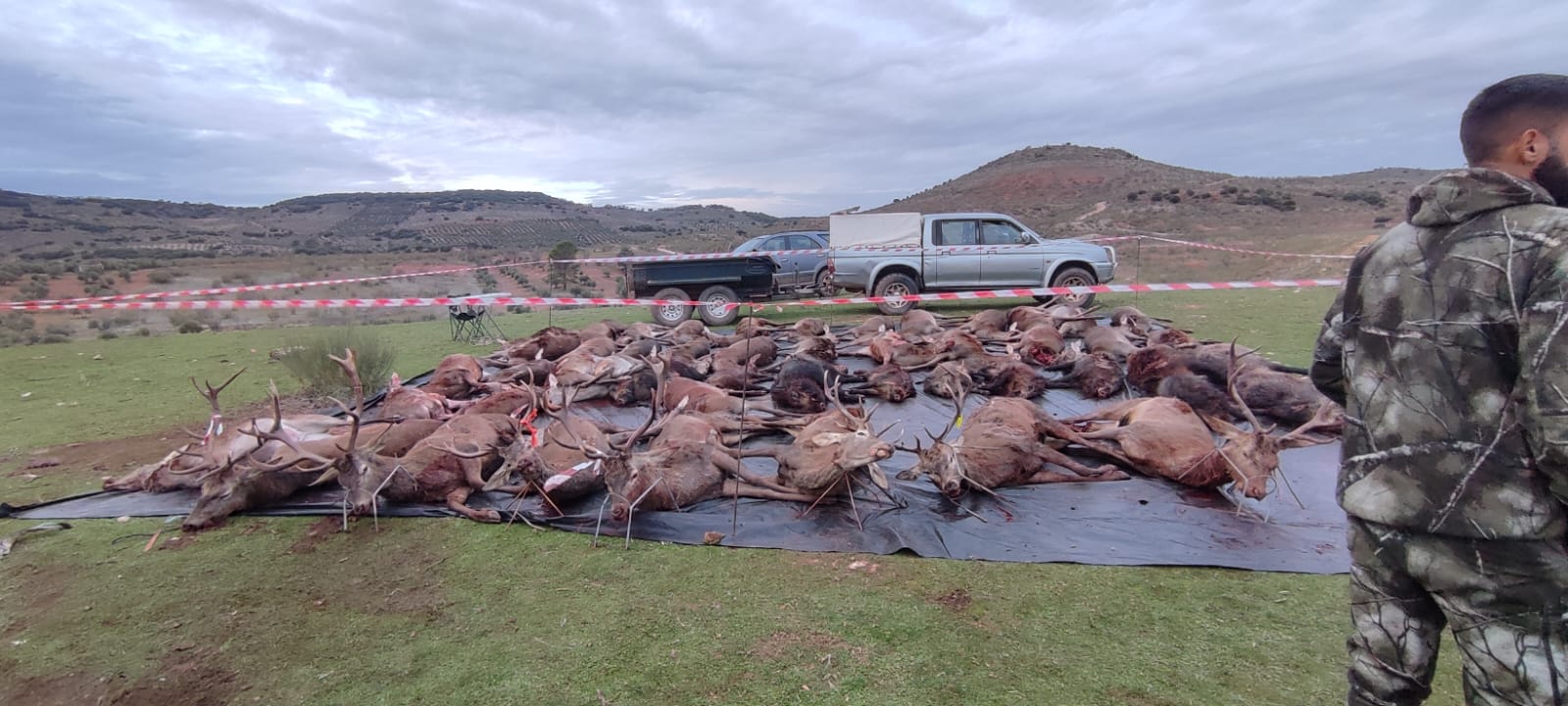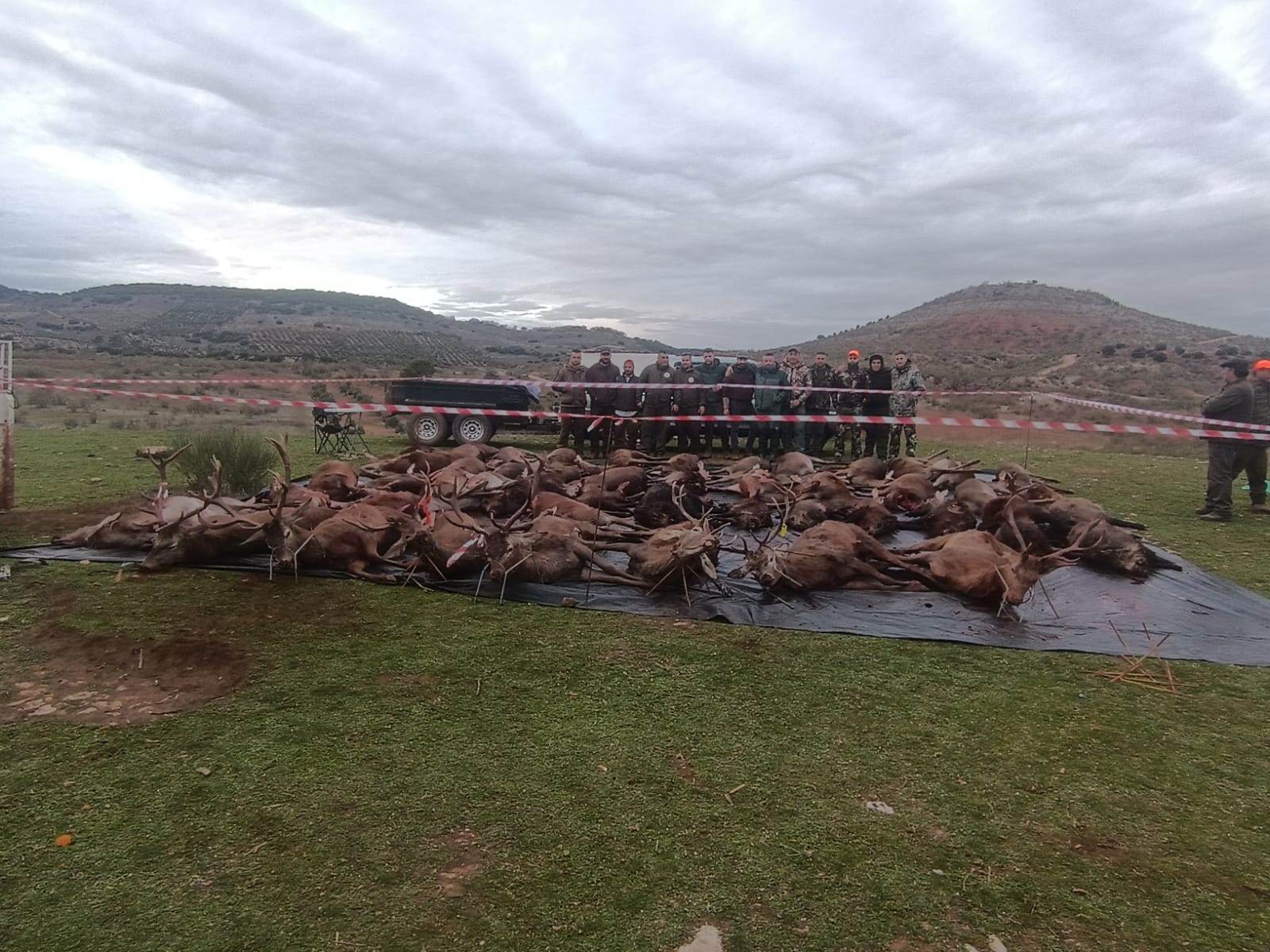 Luego tocó recoger la caza abatida, lo que nos llevó hasta bien oscurecido, por lo que le echamos la foto al plantel con lo que dio tiempo a recoger antes de oscurecer. Se estaba haciendo de noche y faltaba una armada del postor Iván, que tenía 4 guarros, 6 ciervas y 2 ciervos. Gran trabajo de los perreros, postores, el mulero José María, que estuvo hasta de noche sacando bicho, así como la del resto personal de campo que ayudaron a sacra las reses a cargadero.