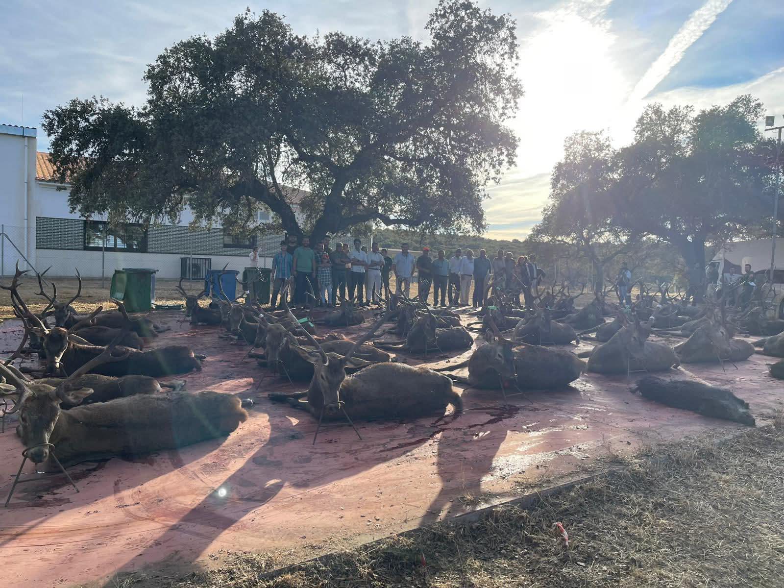 Al final de la jornada, tras un día de intenso tiroteo, se formó un plantel de 46 venados, 12 jabalíes y medio centenar de ciervas, destacando algunos trofeos bonitos de montería en la primera fila del plantel.