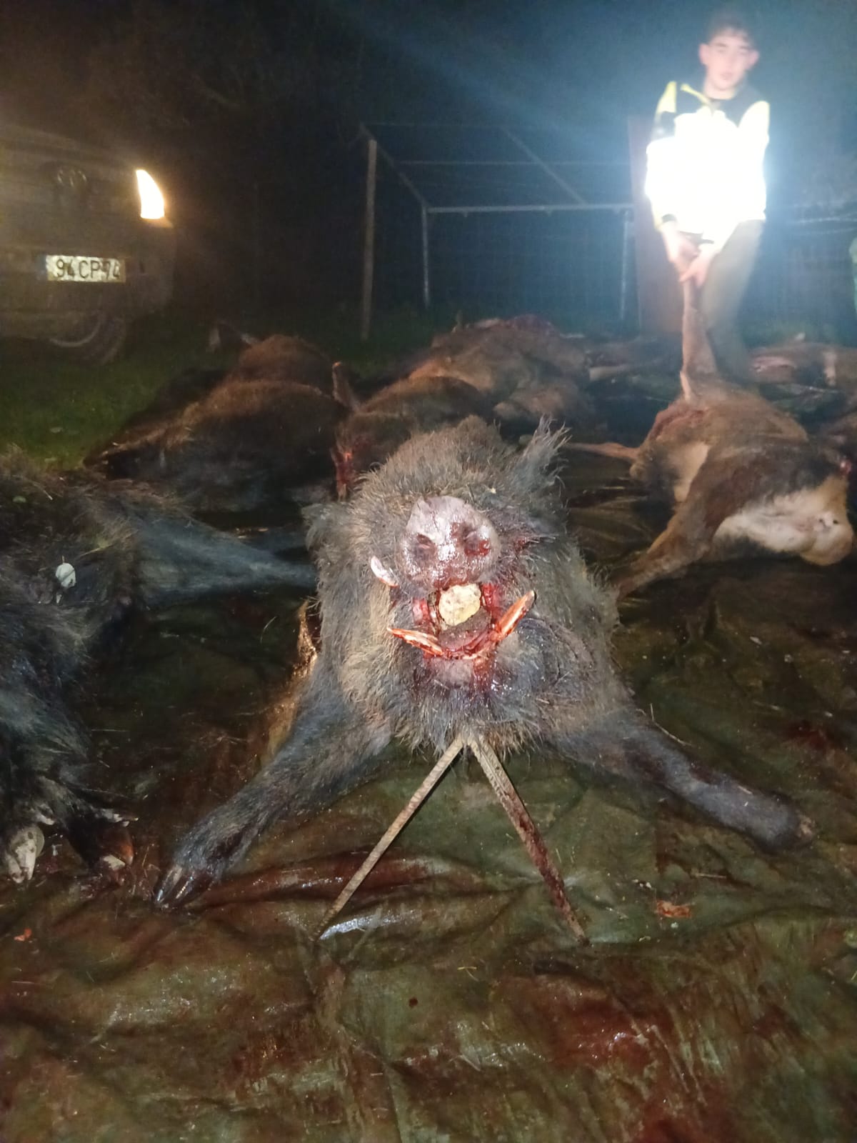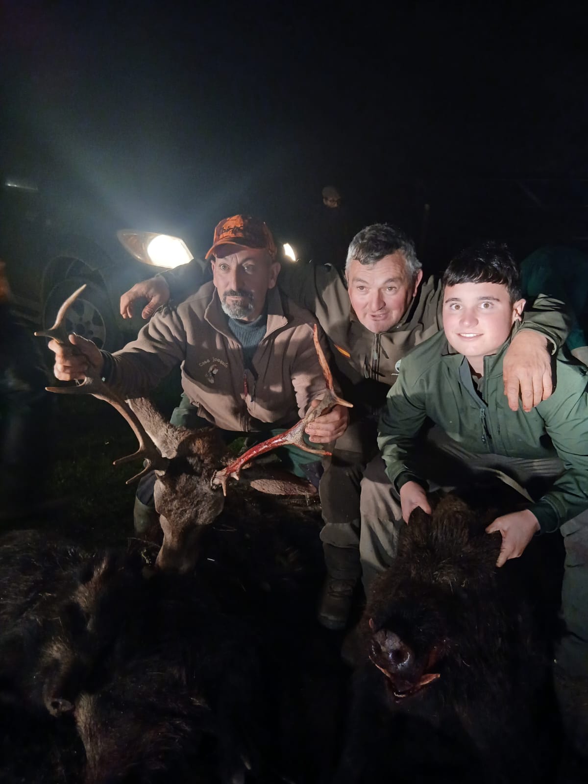 Día de contratiempos de principio a fin, pero al final se pudieron cobrar 24 jabalíes, once venados y tres ciervas, destacando uno de los venados de buen porte, otro de extraña cuerna y el gran cochino cobrado por el amigo Charca apresado por los perros.