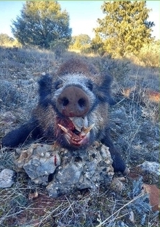 Por ella me enteré del agarre de un gran cochino, que los perreros escuchaban a lo lejos pero que no sabían ubicarlo, por lo que se tuvieron que adelantar a rematarlo. Resultó estar justo detrás del morrito que yo defendía, a unos trescientos metros, pero, como digo con el viento, me fue imposible escucharlo. Allí llegó el amigo Charca que escuchó claramente como chillaba desesperadamente apresado el jabalí, pensando que era una cochina, pero que sorprendido al llegar vio el gran porte y trofeo del animalito que ya no conseguía zafarse de los perros. Allí entregó la cuchara aquel gran luchador que vendió cara su alma, cortando nueve perros de Rafita, Sebas y el propio Charca.