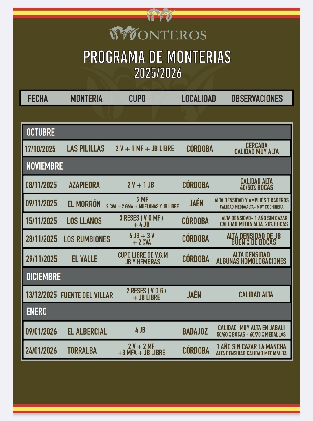 Con un calendario repleto de grandes fincas, auténticos templos de la montería española, la organización cordobesa MONTEROS saca a la venta los últimos puestos para esta próxima temporada, ya que el programa ha vuelto a tener este año tanta aceptación que está a día de hoy prácticamente completo.