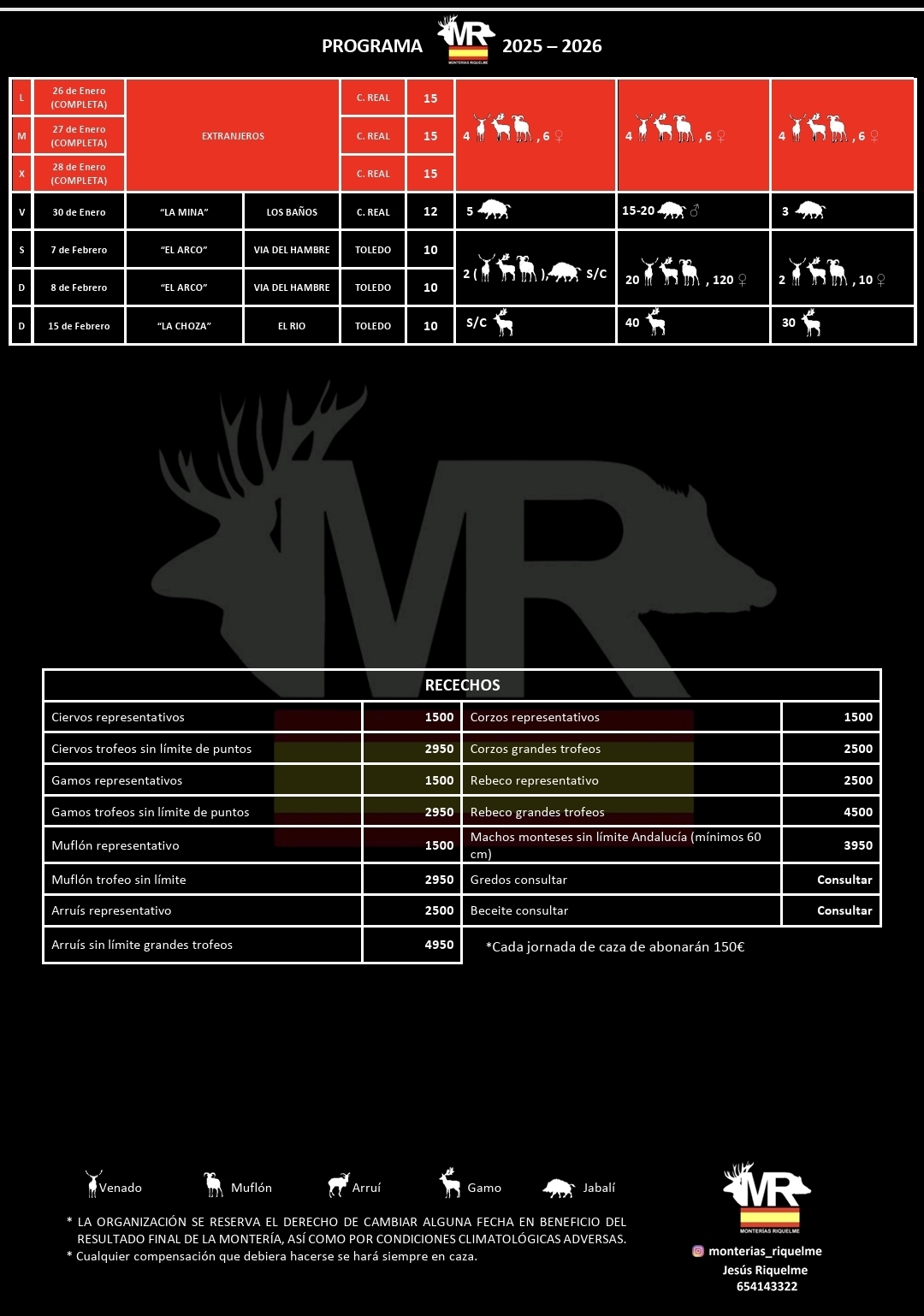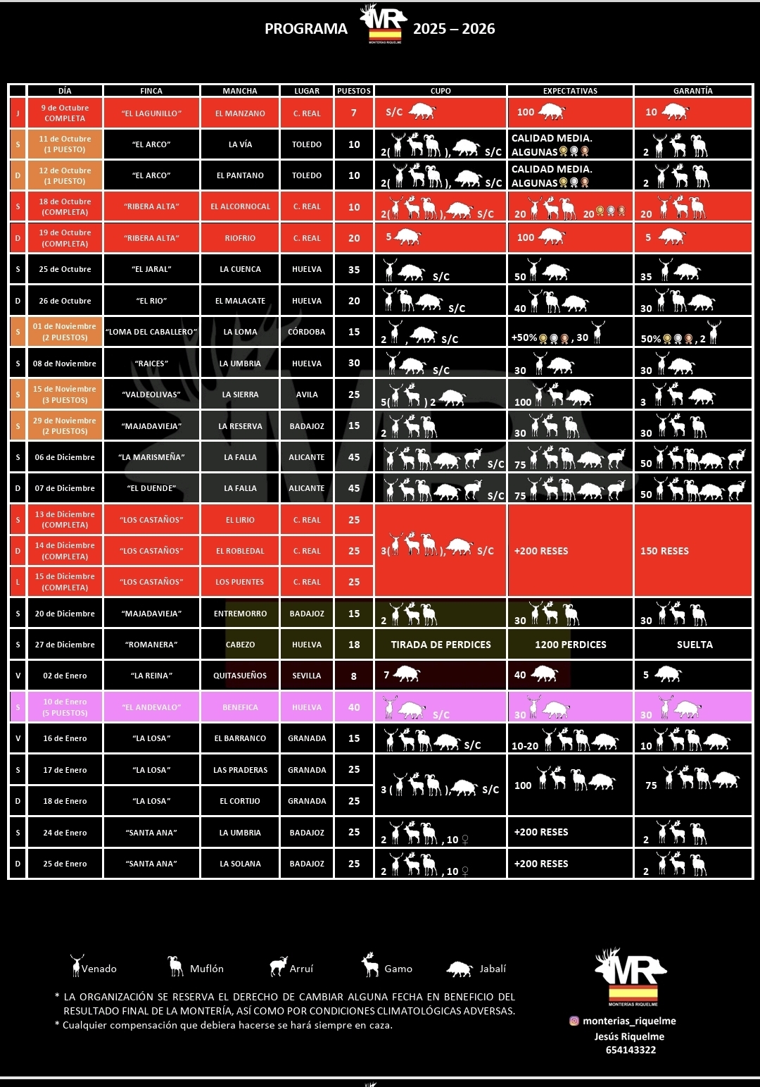 Con 14 monterías COMPLETAS o a punto de completar, y el resto del calendario vendido por encima del 70%, MONTERÍAS RIQUELME ha actualizado recientemente su programa de caza incorporando nuevas monterías.