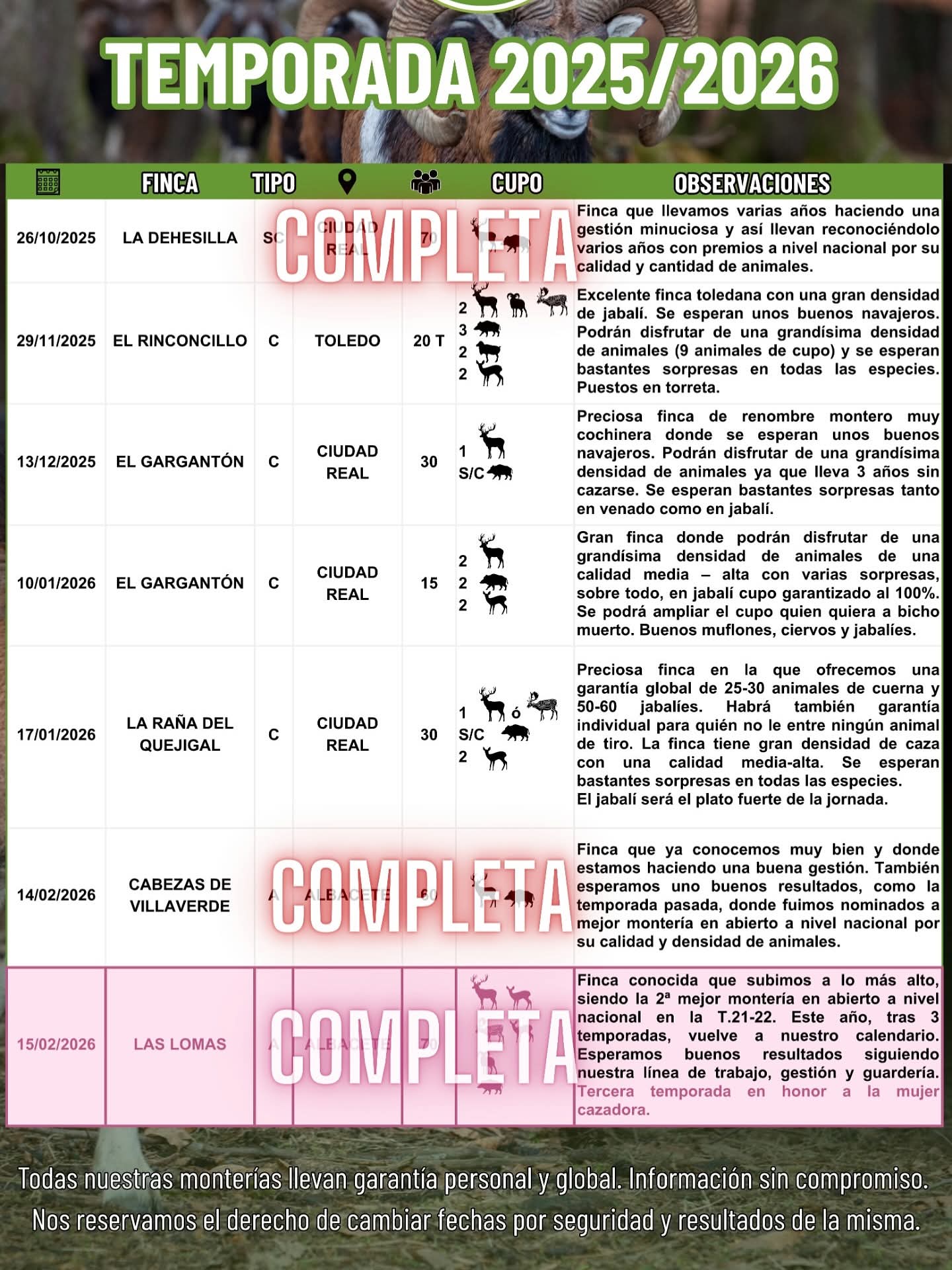 En el día de ayer MRA SERVICIOS CINEGÉTICOS ha anunciado una actualización de su programa de monterías añadiendo una nueva montería al calendario, LA RAÑA DEL QUEJIGAL , finca cercada en la provincia de Ciudad Real que se monteará el 17 de enero con 30 puestos a cupo de 1 macho a elegir entre venado o gamo, 2 ciervas y cochinos libres, que también dará mucho que hablar esta temporada.