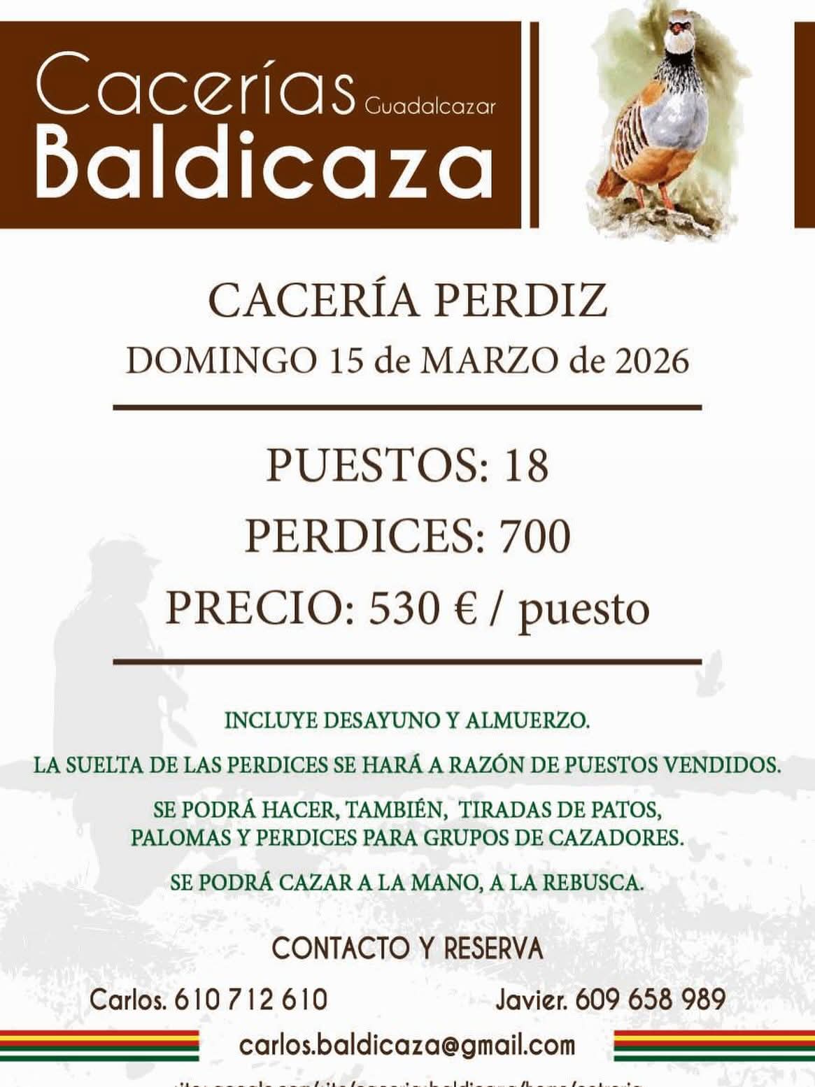 Con más de una década de experiencia y miles de perdices ofertadas en sus afamadas tiradas cada temporada, BALDICAZA se caracteriza por la bravura de sus pájaros y la excelente organización de sus jornadas, resultando todas ellas muy satisfactorias para los cazadores que participan en ellas, repitiendo todos ellos año tras año.