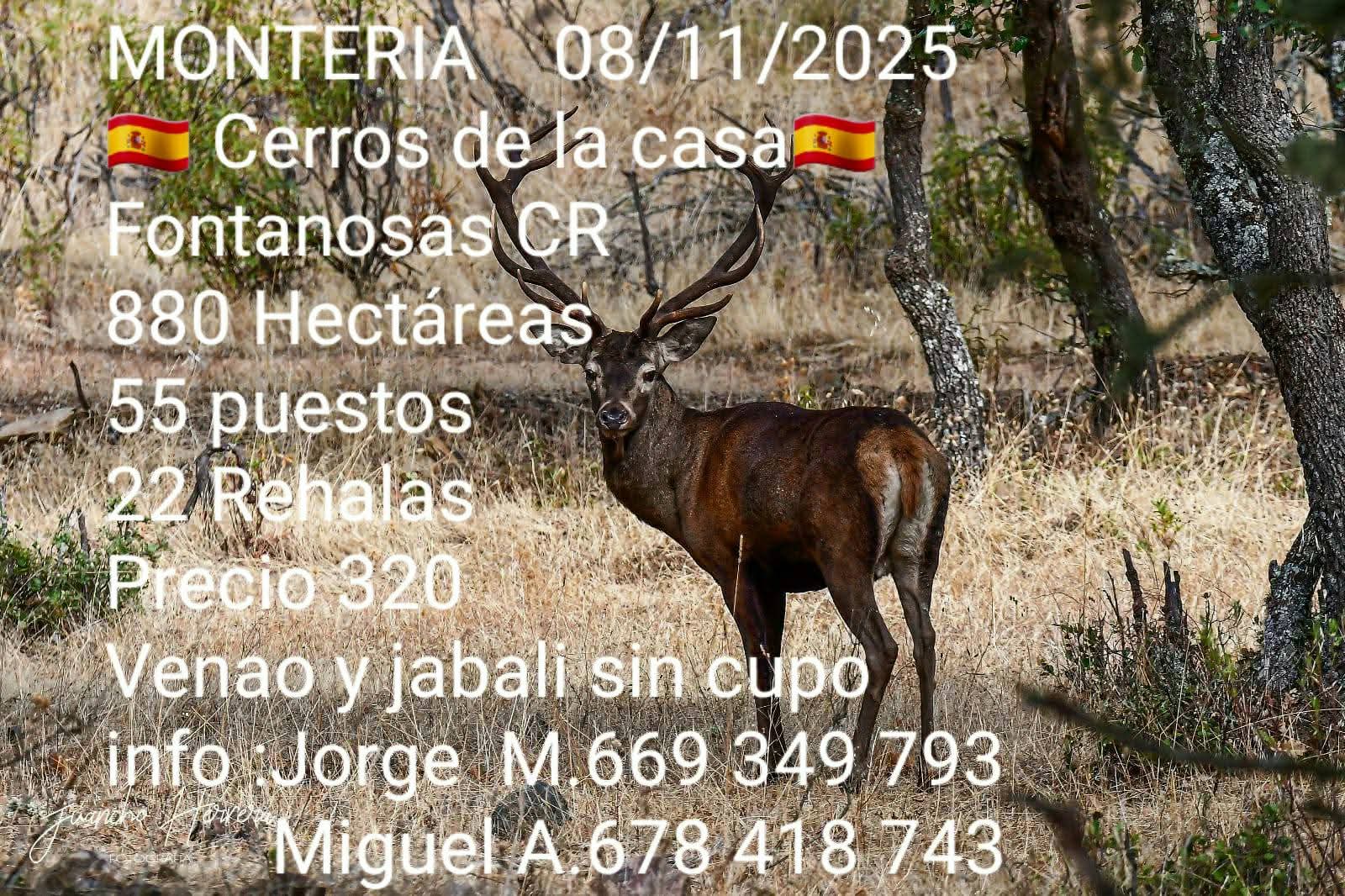 Ubicada en Fontanosas, Ciudad Real, esta finca abierta de 880 has se cazará con  55 puestos y 22 rehalas, y los monteros irán sin cupo sobre venado y jabalí.