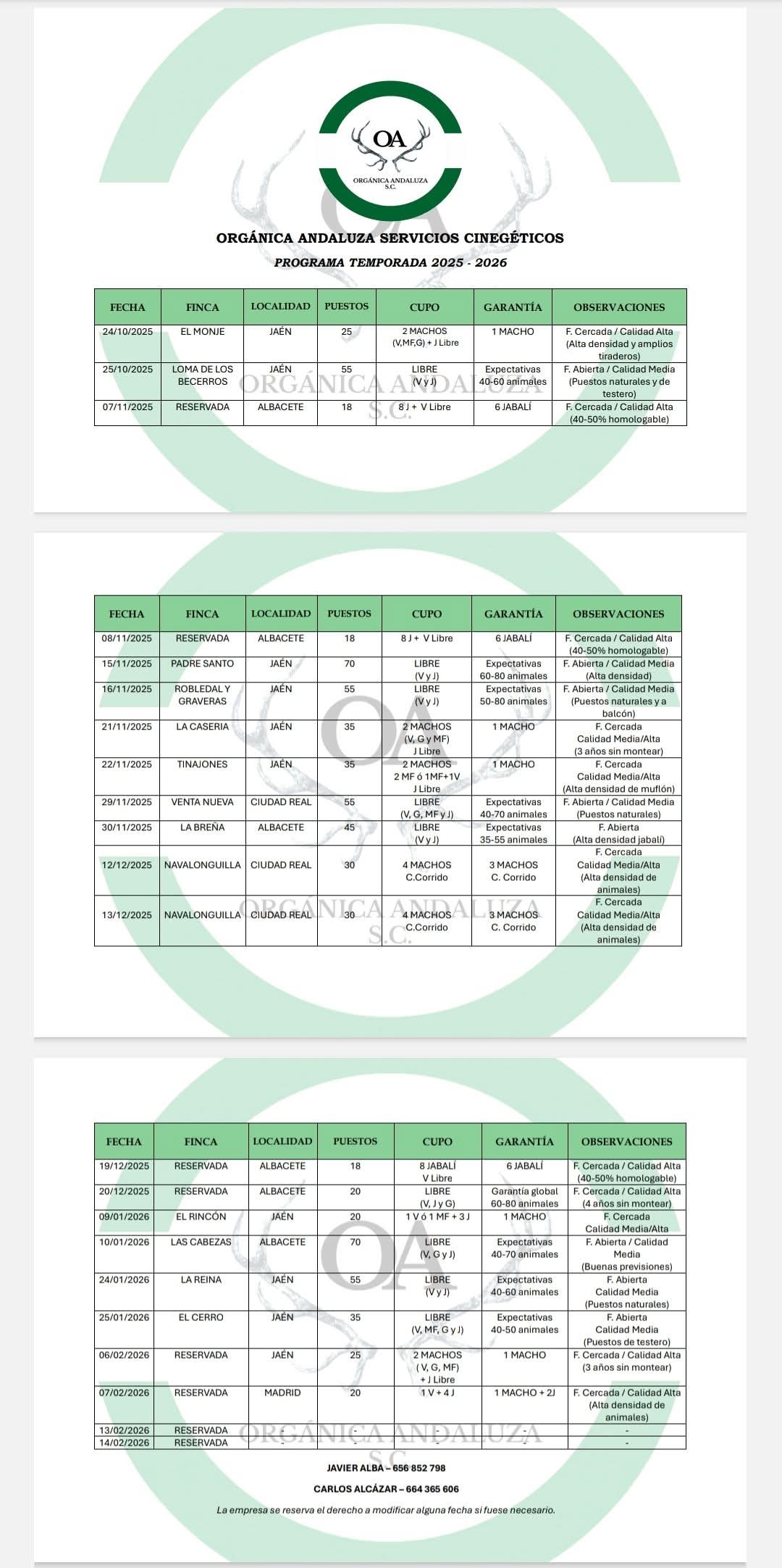 ORGÁNICA ANDALUZA SC pone a la venta los últimos puestos de la montería que ofrecerá el 22 de noviembre en LOS TINAJONES, Jaén, finca cercada que se montea a cupo garantizado 100% de 2 reses a elegir ente venado y muflón, más muflonas y jabalíes libres.